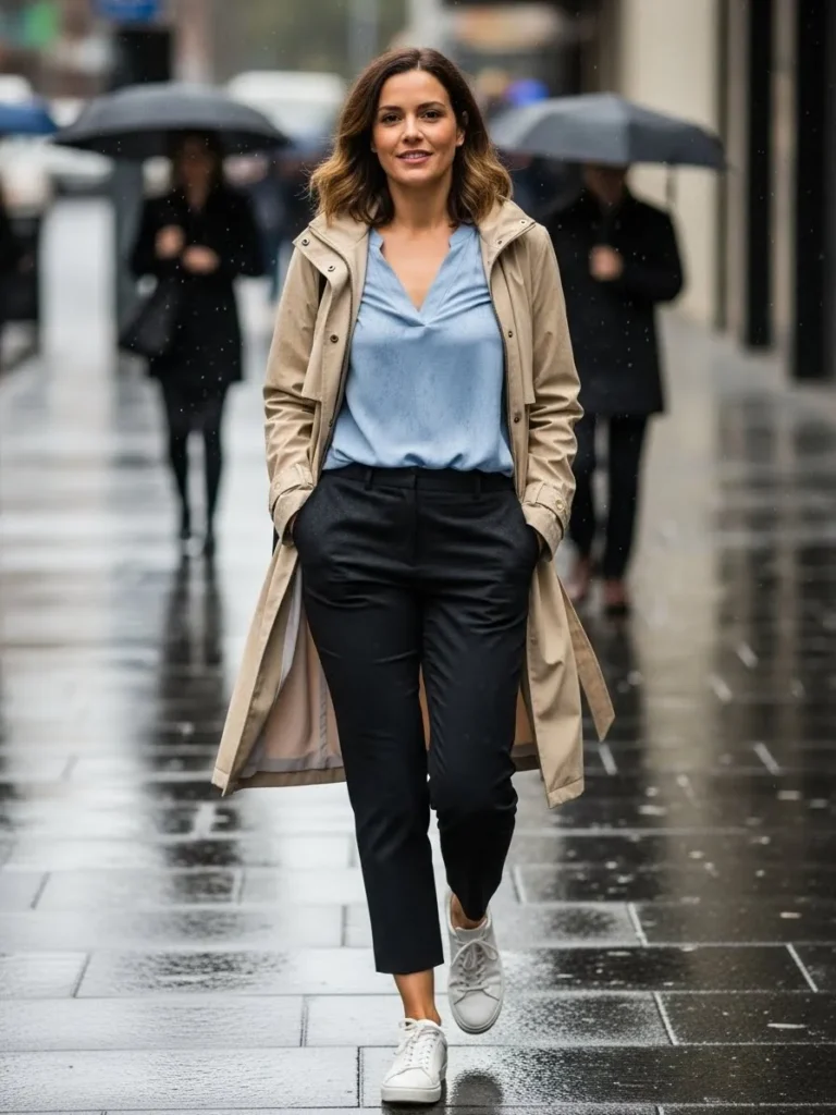 A classic trench coat is styled with a light blue button up shirt and tailored black pants. White sneakers give the look a fresh and relaxed finish. The mix of crisp and casual pieces keeps it balanced.