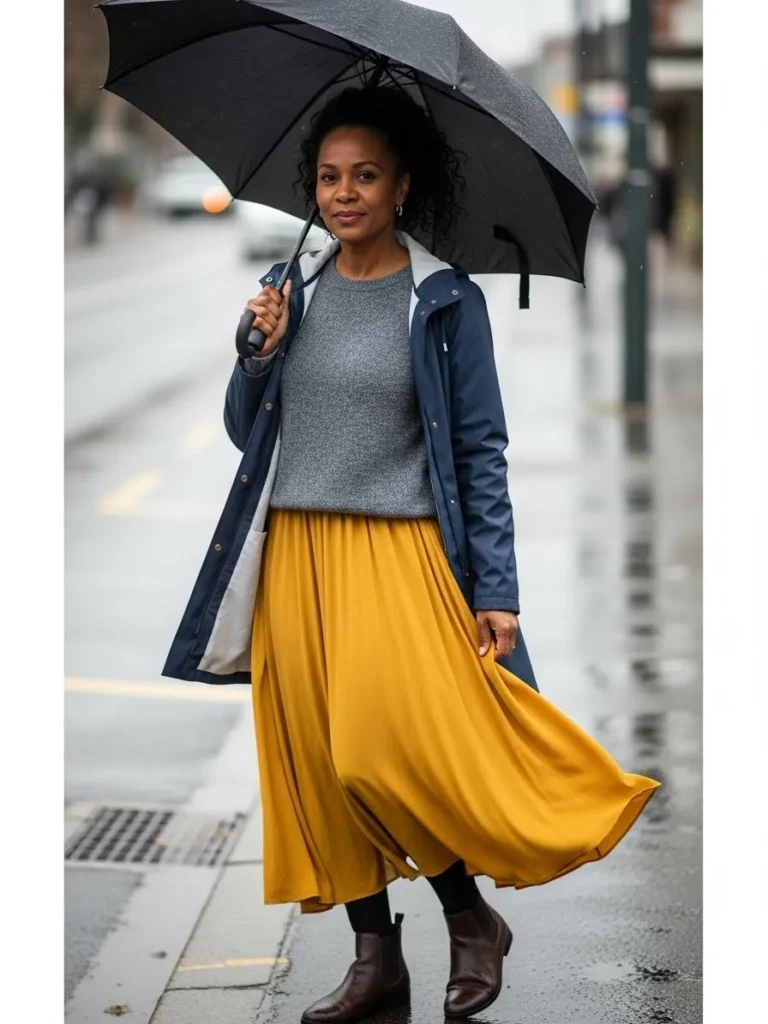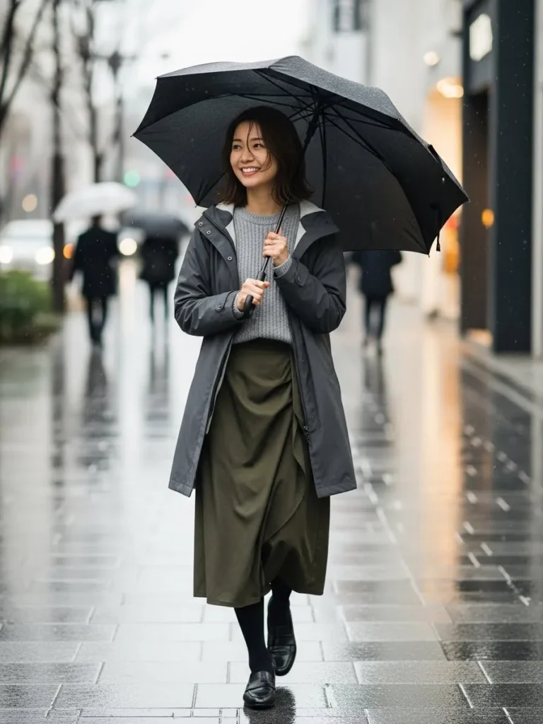 A cozy gray coat layered over a muted olive midi skirt creates a calm and modern rainy day look. The outfit is finished with dark tights and sturdy ankle boots that feel practical without losing style. The umbrella blends in perfectly with the soft neutral tones.