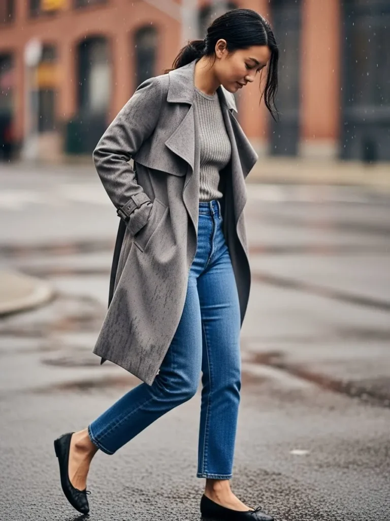 A gray trench coat is layered over a simple top and cropped blue jeans. Black flats add a polished touch without sacrificing comfort. The overall vibe feels relaxed and very city friendly.