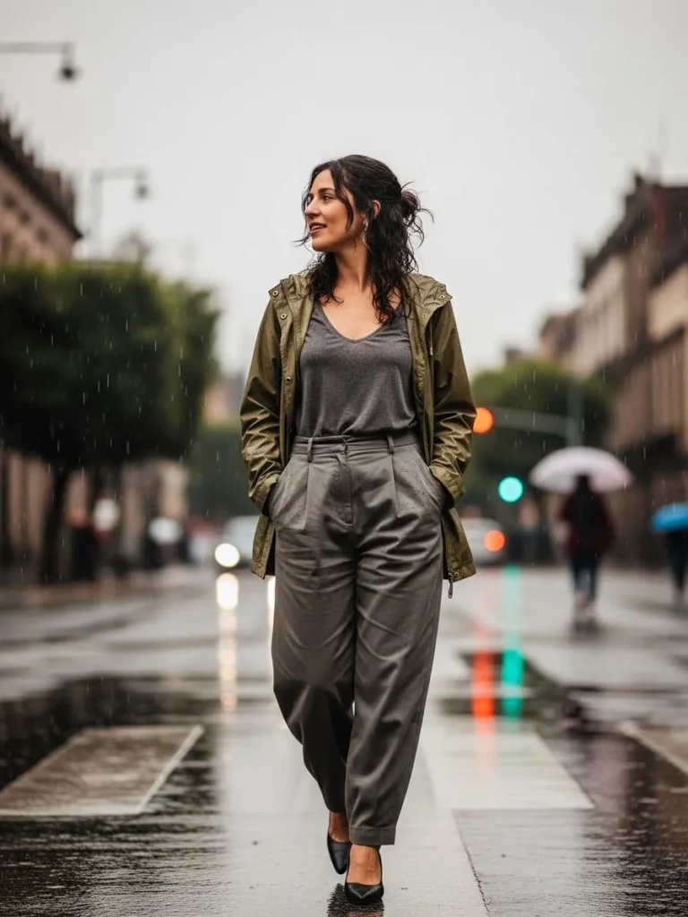I am always drawn to outfits like this because they feel smart without trying too hard. The proportions are so flattering and the trousers make the whole look feel elevated. It is perfect for days when I want to feel stylish but still comfortable in the rain.