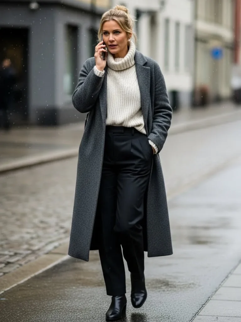 A long charcoal coat is styled over a chunky cream knit and tailored black pants. Black boots ground the outfit and make it weather friendly, while the knit adds warmth and softness. The color palette feels calm and elegant.