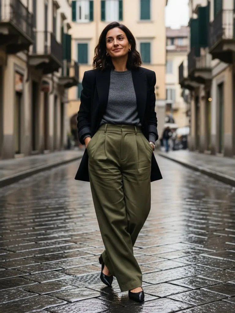This outfit features a black blazer paired with high waisted olive trousers and a simple gray top. The tailored pieces feel modern and confident, while the loose fit keeps everything effortless. Neutral shoes pull the look together without stealing attention.