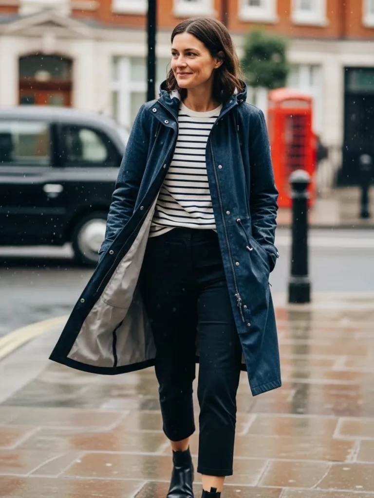 A deep navy rain coat is layered over a striped top and cropped dark jeans for a fresh and timeless feel. Black ankle boots ground the look and keep it practical for wet pavement. The overall vibe feels easy and very wearable.