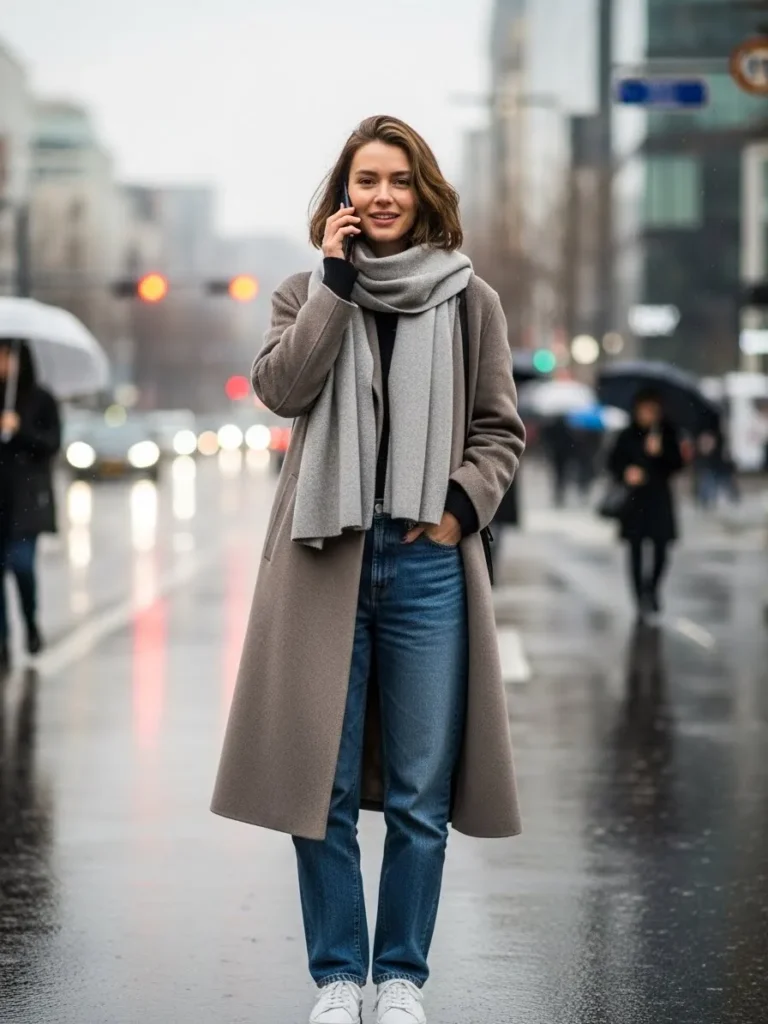 A long taupe coat paired with straight leg jeans and a chunky gray scarf creates a soft and approachable rainy day outfit. Light sneakers add comfort, while the layered textures keep the look interesting. Everything feels calm and balanced.