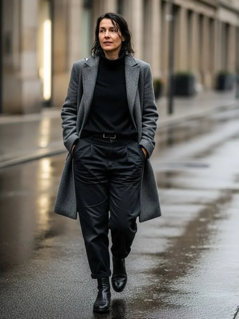 A long dark gray wool coat layered over an all black outfit creates a strong and modern silhouette. Slim black pants and sturdy boots keep the look grounded and weather ready. The textures add depth without needing extra color.
