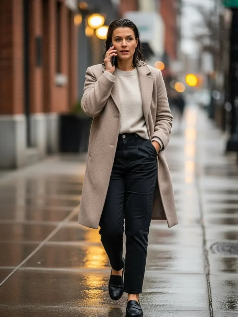 This outfit pairs a light beige coat with a cozy neutral knit and sleek black pants. Simple black flats keep it practical, while the clean color palette feels timeless and calm. The overall look is polished without feeling stiff, which works perfectly on rainy city streets.