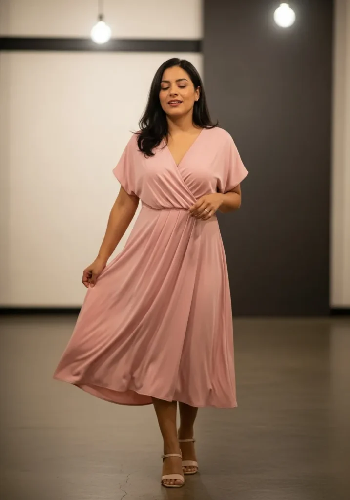 This blush pink midi dress features gentle pleats that add texture and movement to the look. The wrap inspired neckline creates a soft and flattering shape, while the flowing skirt keeps everything light and elegant. The overall vibe feels romantic and timeless, especially when styled with delicate heels.