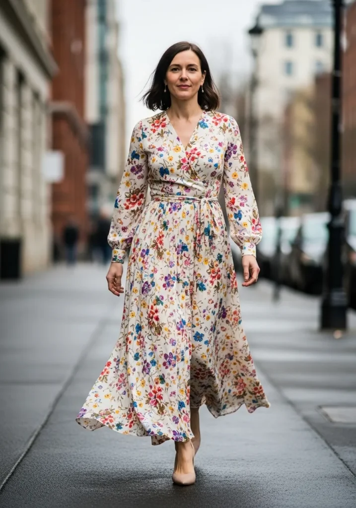 This floral dress brings a soft feminine feel with its flowing silhouette and delicate pattern. The long sleeves balance the airy skirt, making it perfect for cooler spring days. The floral print adds charm without overpowering the look, keeping everything light and graceful.