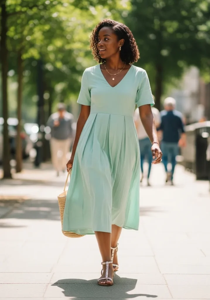 This mint green midi dress features a relaxed fit with a softly flowing skirt that moves naturally. The simple neckline and short sleeves keep the look clean and fresh, while the pastel color adds a sweet springtime touch. Paired with neutral sandals, the outfit feels calm and effortlessly chic.