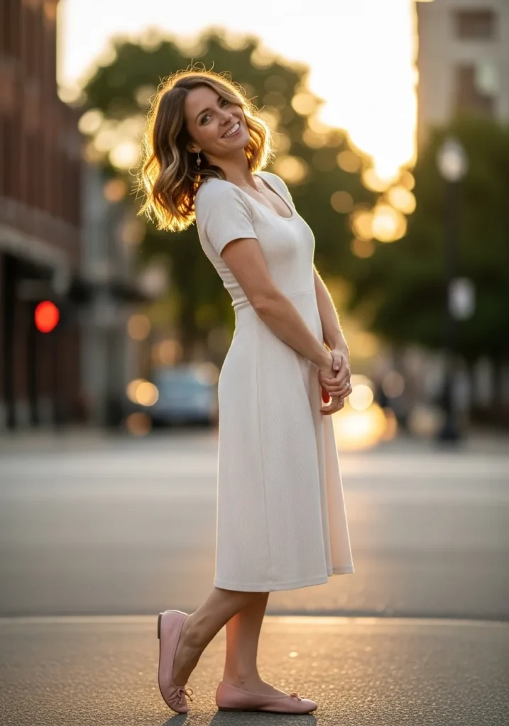 This white midi dress offers a clean and refreshing look with a gently fitted waist and airy skirt. The short sleeves and lightweight fabric make it ideal for warmer spring days. Styled with simple heels and a small bag, the outfit feels classic and feminine.