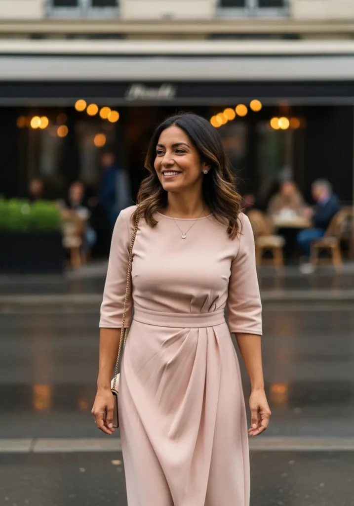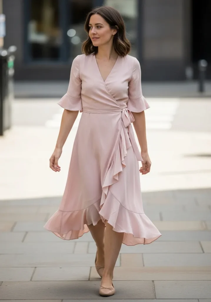 I really love how this dress balances structure and ease. The wrap style always feels forgiving and flattering, and the blush color adds that soft romantic touch I can never resist. It’s the kind of outfit that makes me feel confident without needing extra styling.
