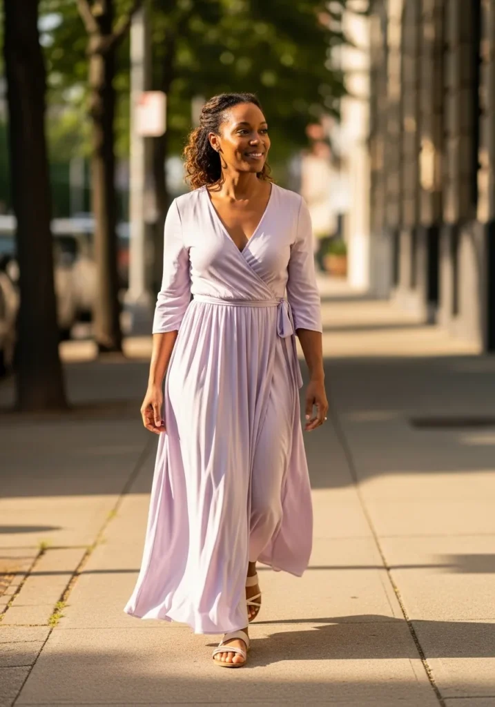 This lavender wrap dress features a flowing skirt and a softly defined waist that creates beautiful movement as you walk. The long sleeves add balance while the pastel tone keeps everything light and spring ready. The overall look feels romantic and airy.