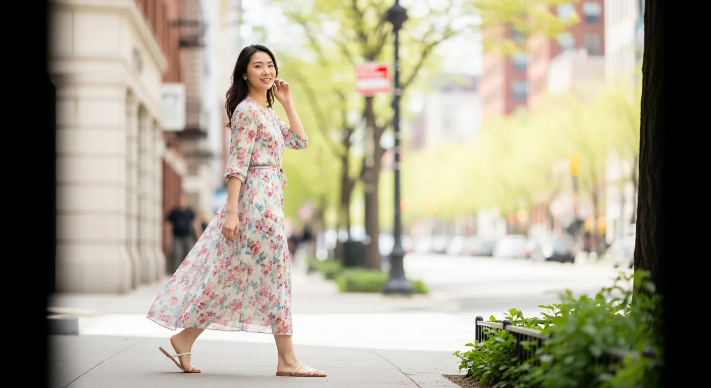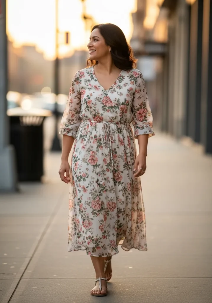 This outfit features a flowy midi dress in a delicate floral print with soft pastel tones that feel very spring ready. The lightweight fabric drapes gently over the body, with a subtle waist definition and relaxed sleeves that add to the romantic vibe. The length hits just right, giving it an airy and graceful feel that moves beautifully while walking.