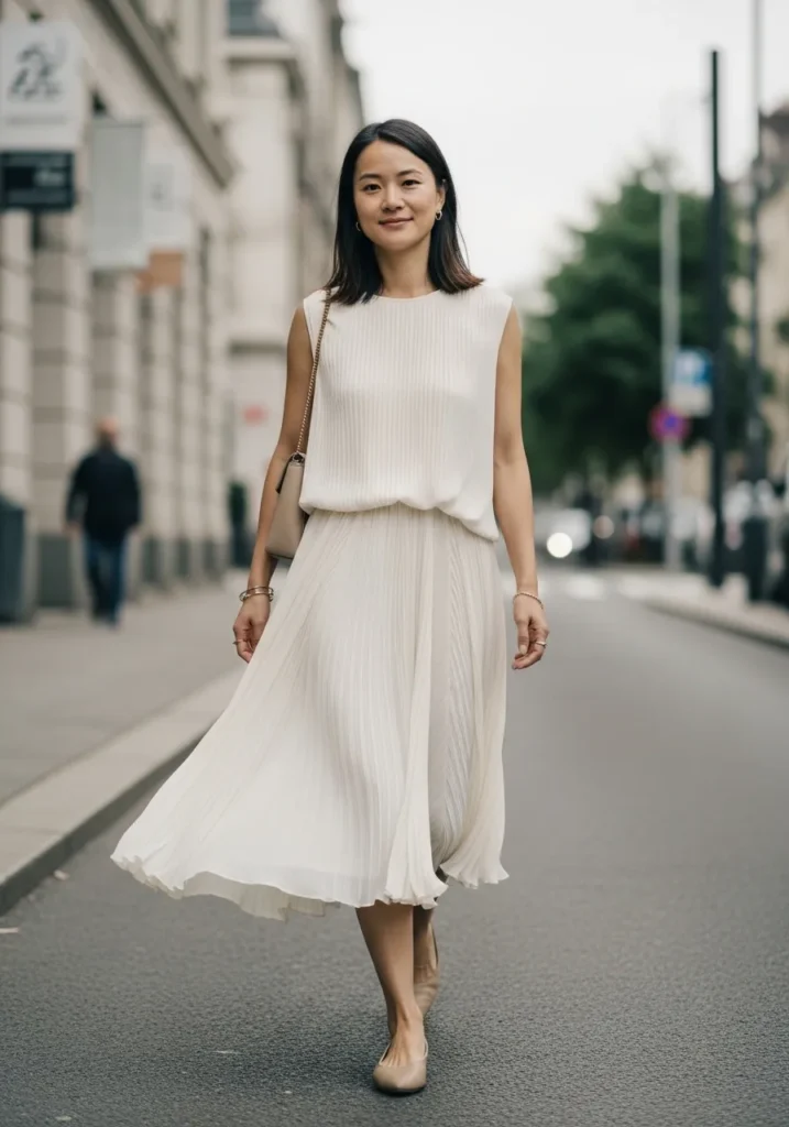 This look showcases a sleeveless cream dress with clean lines and a softly flowing skirt. The fabric looks light and smooth, creating an understated silhouette that feels calm and refined. Its simple design lets the movement of the dress shine, giving it an elegant presence without any extra fuss.