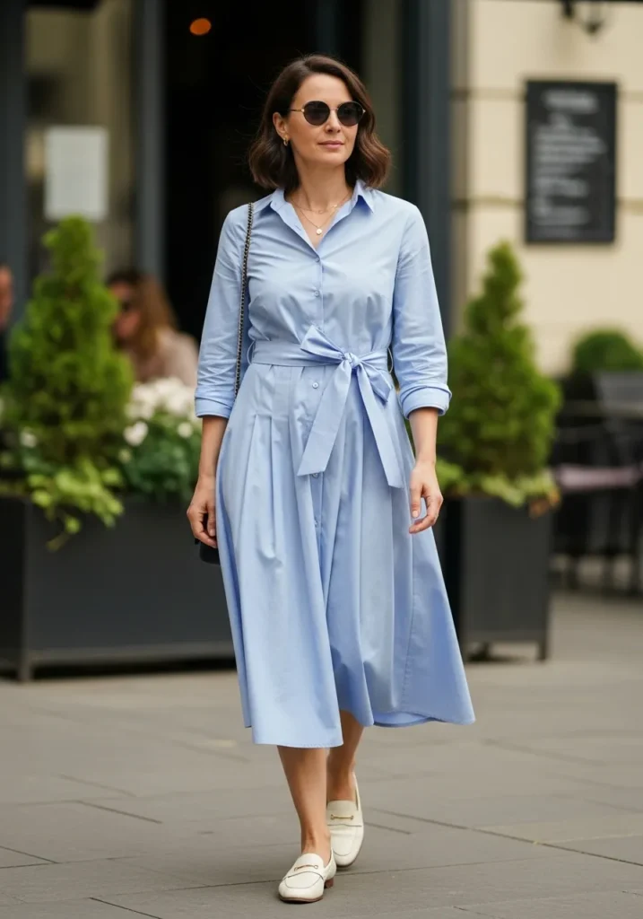 This outfit features a light blue shirt dress with a cinched waist and an easy knee length hem. The structured collar and buttons balance beautifully with the soft fabric and relaxed fit. The color feels fresh and airy, perfect for spring days that call for something polished yet comfortable.