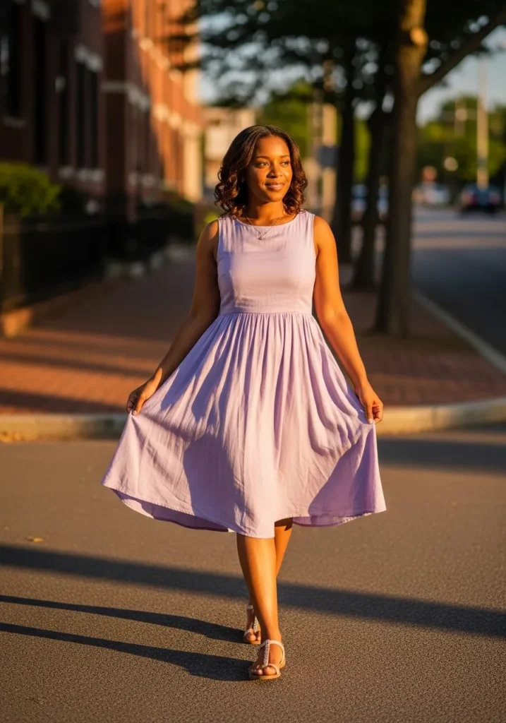 This look highlights a sleeveless lavender dress with a flattering fit and flare shape. The skirt moves freely with each step, creating a playful and graceful silhouette. The gentle pastel shade adds a dreamy touch that feels light and joyful.