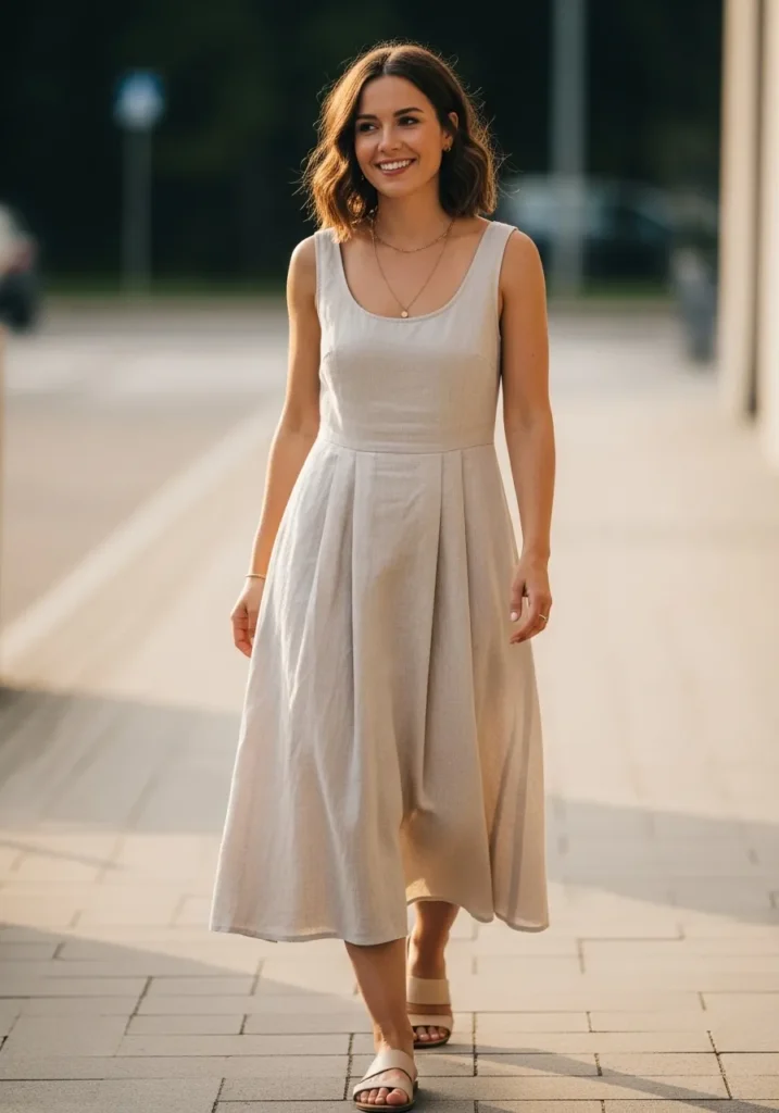 This outfit shows a sleeveless neutral toned midi dress with a softly gathered waist and flowing skirt. The fabric appears light and breathable, giving it a relaxed yet refined look. Its simplicity allows the silhouette to shine, making it feel classic and feminine.