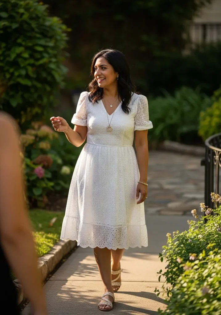 This look showcases a white eyelet dress with delicate detailing and a relaxed knee length fit. The textured fabric adds interest while keeping the overall look light and airy. It feels crisp, feminine, and perfect for sunny spring days.