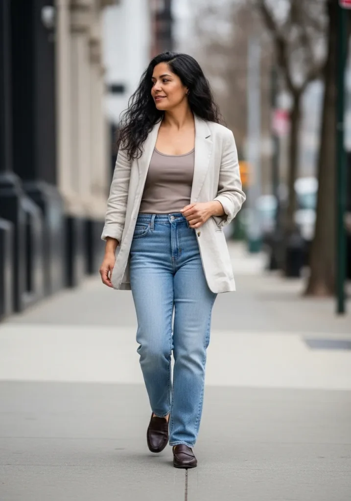 A light blazer layered over a white top and classic blue jeans creates an effortlessly chic spring outfit. The fitted blazer adds structure while the relaxed denim keeps things casual and wearable. Soft ballet flats give it a feminine finish and make it perfect for busy days on the go. The whole look feels fresh, clean, and very city friendly.