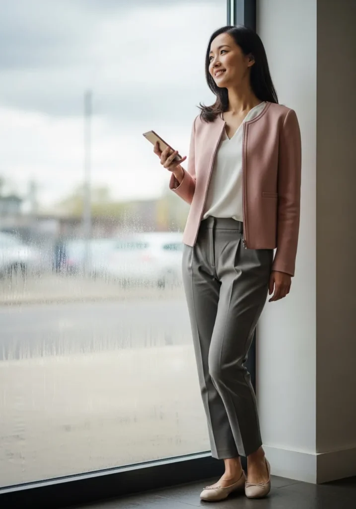 This outfit features a light blush pink jacket layered over a soft neutral top and slim gray trousers with a clean, tailored fit. The fabrics look smooth and lightweight, perfect for spring days when you want polish without heaviness. Finished with simple flats, the overall look feels calm, modern, and effortlessly professional.