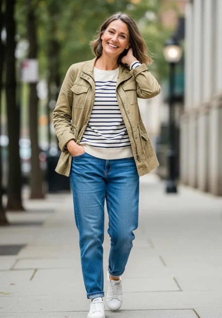 A relaxed olive utility jacket is worn over a classic striped tee and easy blue jeans with natural movement. The jacket adds structure while still feeling casual, and the stripes bring in that timeless French girl vibe. White sneakers keep the outfit light and comfortable for everyday wear.