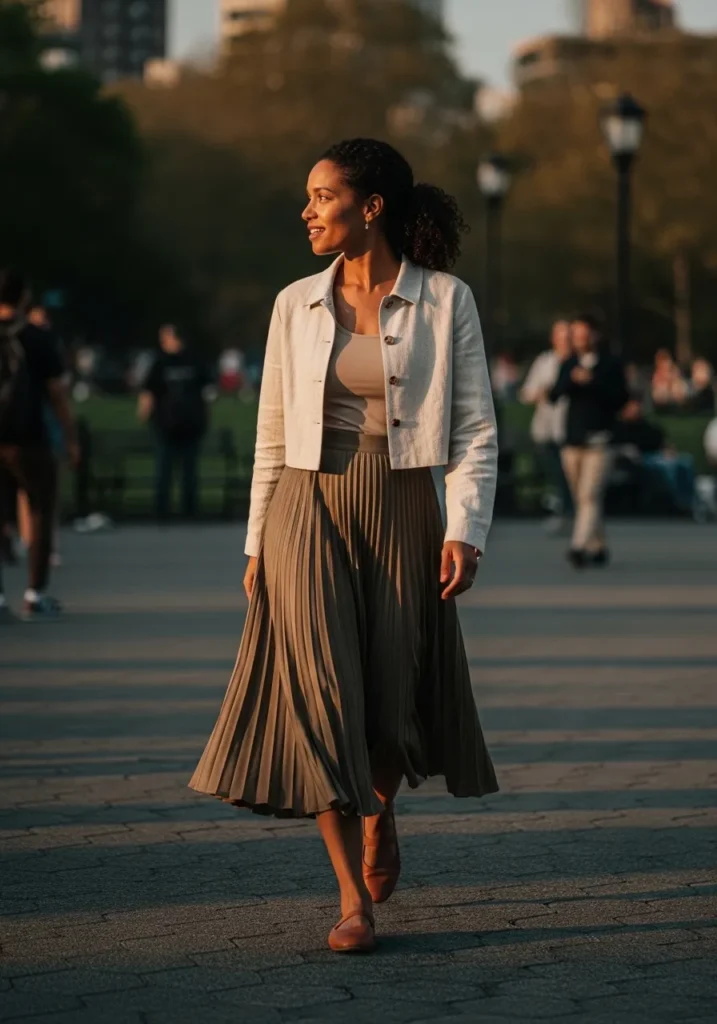 This look pairs a soft neutral jacket with a fitted top and a pleated midi skirt that moves beautifully while walking. The contrast between the structured jacket and the flowy skirt creates a really elegant balance. Neutral heels keep the outfit refined and feminine.