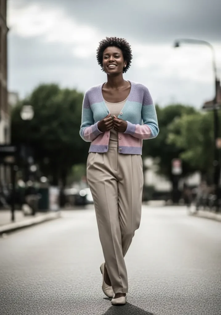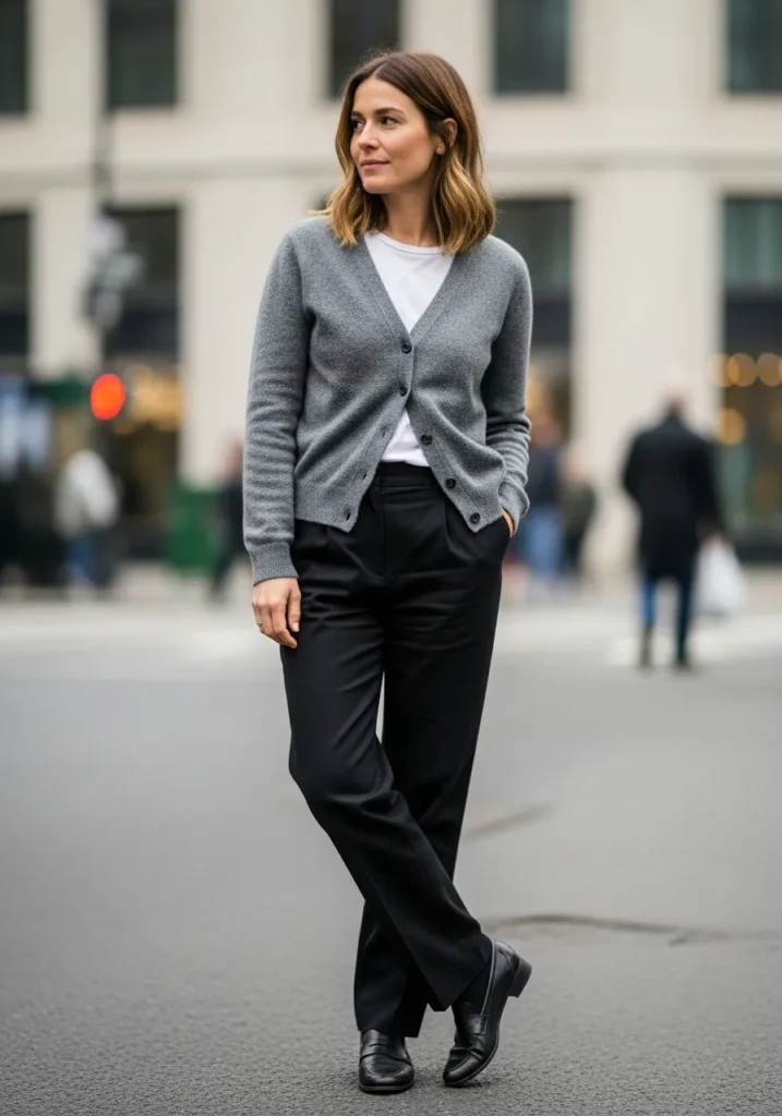 Soft Cardigan With Relaxed Black Trousers