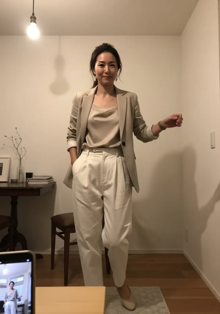 This outfit features a lightweight beige blazer worn over a draped top and relaxed trousers in matching neutral tones. The fabrics look soft and breathable, giving the outfit an easy, lived in elegance. Flats keep the look comfortable and understated.