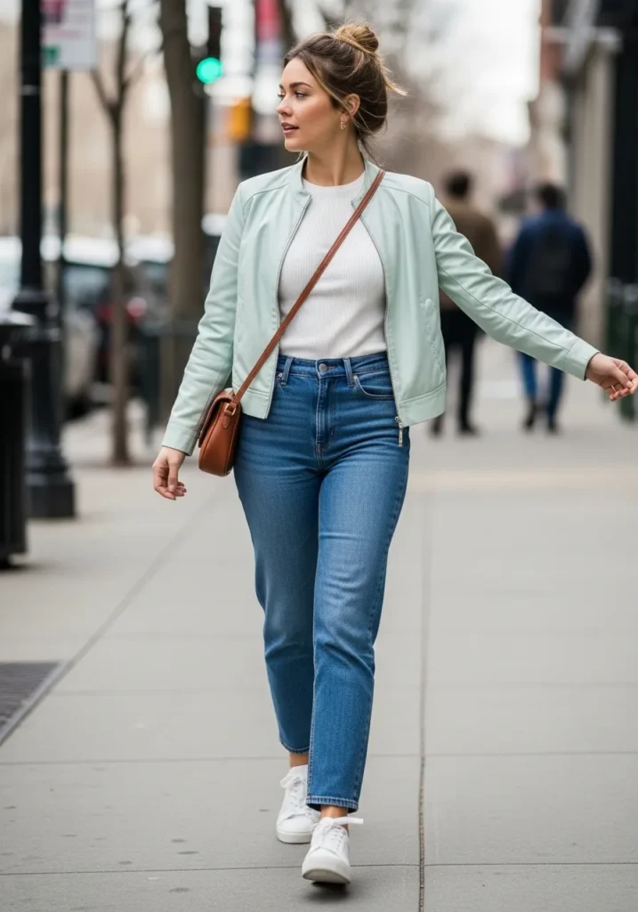 A lightweight green jacket layered over a neutral top and blue jeans creates a fresh and laid back spring outfit. The soft color adds personality without feeling too bold. White sneakers keep it casual and perfect for walking around all day. The overall vibe is relaxed, youthful, and easygoing.