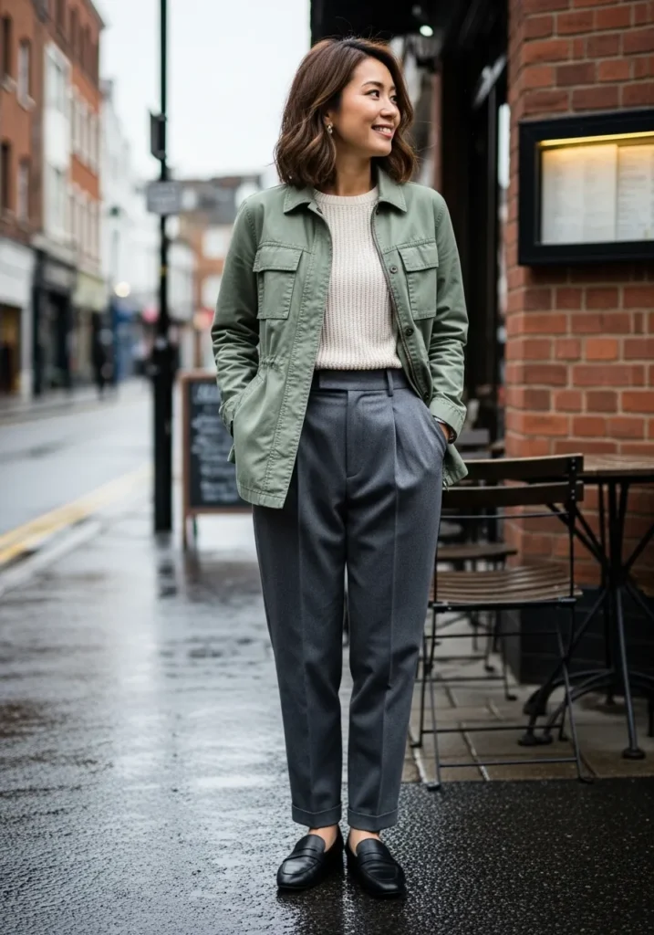 This outfit pairs a lightweight olive utility jacket with a soft cream knit top and tailored charcoal trousers that have an easy drape. The cropped length of the jacket keeps things fresh for spring, while the neutral palette feels calm and effortless. Finished with simple black flats and minimal accessories, the whole look gives off that clean city casual vibe without trying too hard.