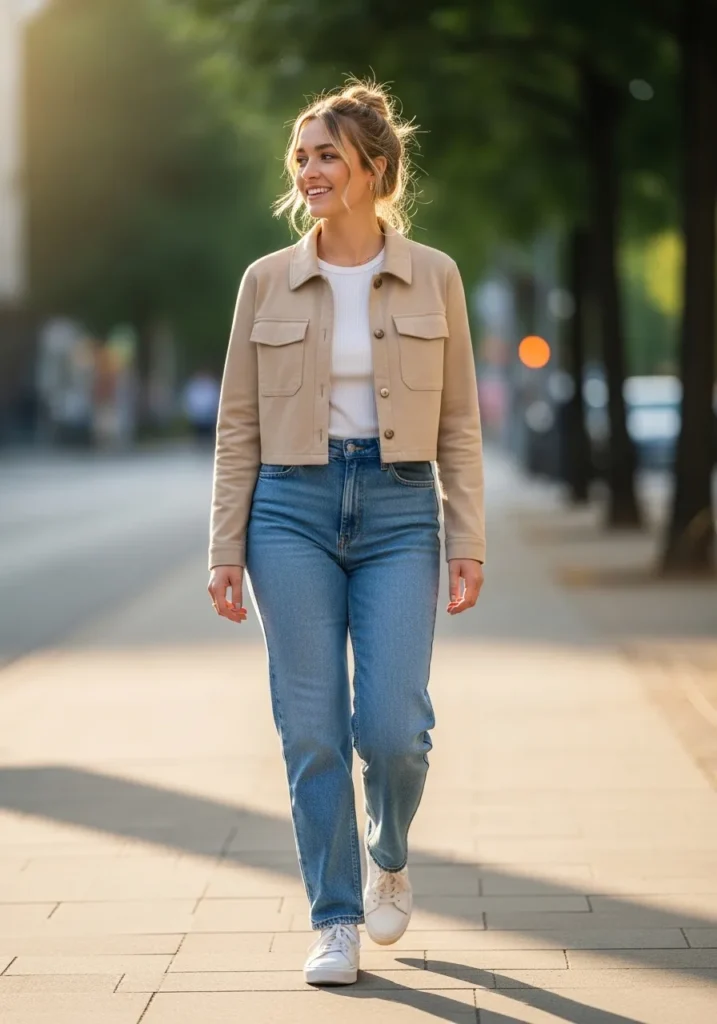 This look pairs a cropped neutral jacket with a simple top and classic blue jeans for a clean and modern spring outfit. The shorter jacket length keeps the silhouette flattering and light, while white sneakers add a sporty and youthful touch. The soft color palette feels calm and fresh, perfect for sunny walks. The overall vibe is minimal, relaxed, and very wearable.