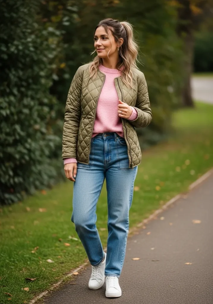 A lightweight quilted jacket in a soft olive shade is layered over a blush pink sweater and straight leg jeans. The quilted texture adds interest while staying light enough for spring, and the relaxed denim keeps the look casual and comfortable. Simple sneakers complete the outfit with an easygoing feel.