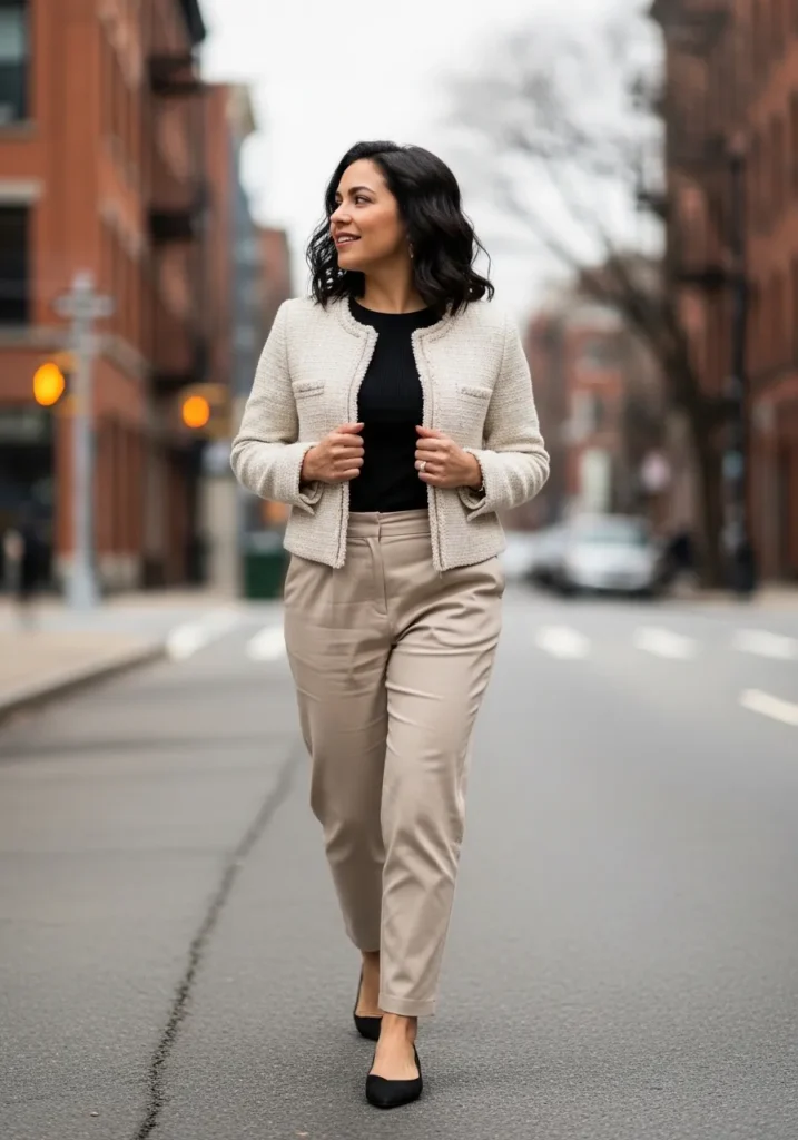 This outfit pairs a soft neutral jacket with a simple black top and tailored beige pants for an easy polished feel. The clean lines and light colors keep everything fresh and spring ready, while the cropped length adds a modern touch. Black flats ground the look and keep it practical for city walking without losing style. The overall vibe feels calm, confident, and quietly chic.