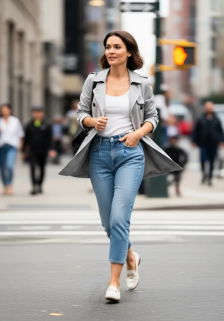 This outfit features a lightweight beige trench jacket layered over a classic striped tee and relaxed blue jeans. The soft neutral tones feel fresh and timeless, while white sneakers keep everything easy and spring ready. The slightly open jacket adds movement and that effortless walking through the city vibe. Overall, it feels casual, clean, and quietly stylish without trying too hard.