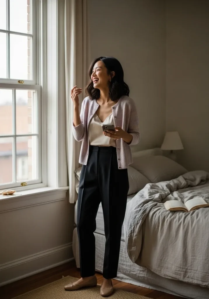 This look features a lightweight cardigan layered over a simple top and paired with relaxed black trousers. The soft fabrics and neutral tones give it a cozy yet refined feel that works beautifully indoors or out. Flats keep it comfortable while maintaining a clean and minimal aesthetic. The overall mood is calm, effortless, and quietly stylish.