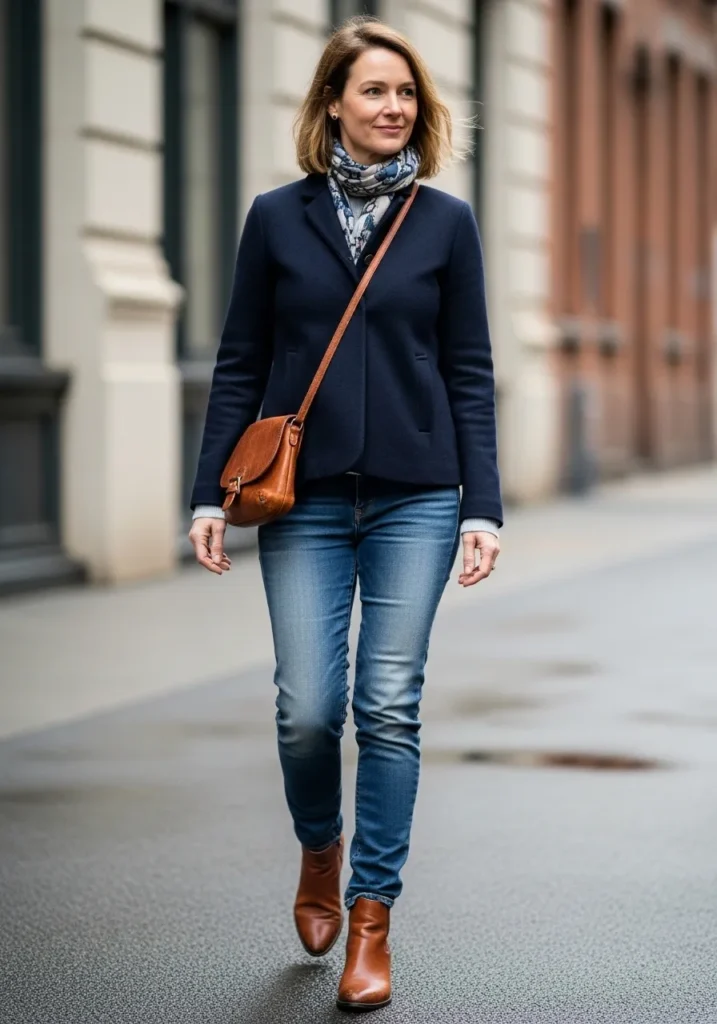 A structured navy jacket layered over a simple top and blue jeans creates a timeless spring outfit. The scarf adds a soft touch of texture and interest while ankle boots bring a slightly elevated edge. The color palette stays classic and wearable without feeling dull. This look feels polished, practical, and very put together.