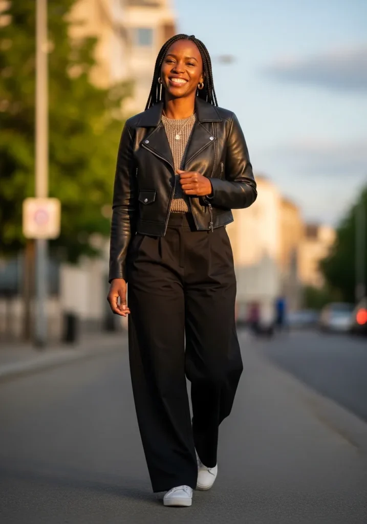 This outfit layers a black jacket over an all black base for a sleek and confident spring look. The mix of textures keeps it interesting while the clean silhouette feels modern and flattering. White sneakers add contrast and keep the outfit grounded and wearable. The vibe is bold, effortless, and cool without trying too hard.
