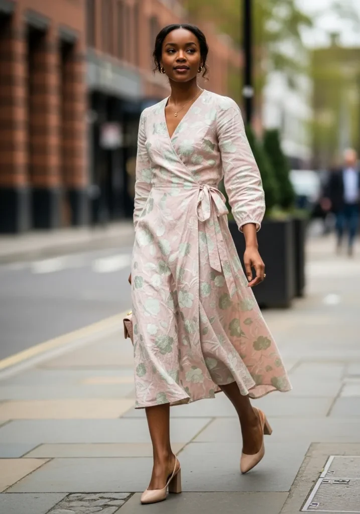 This outfit showcases a light floral wrap dress with a flattering tie waist and flowy skirt. The soft pastel print feels romantic and airy while the midi length keeps it elegant. Neutral heels finish the look beautifully.