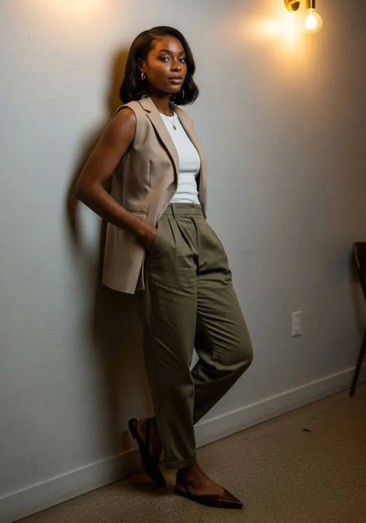 This look pairs a sleeveless beige tailored vest with a crisp white fitted tank and olive high waisted trousers that fall effortlessly through the leg. The fabric mix feels structured yet relaxed, with clean lines up top and a soft drape on the pants. Simple flats and minimal jewelry keep the outfit grounded and polished without feeling overdone, giving it that quiet confident spring energy.