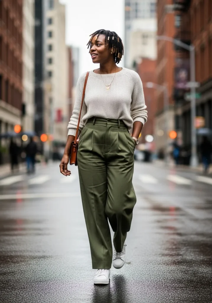 Here we have an easy knit sweater tucked into olive green high waist trousers, styled with clean white sneakers and a casual crossbody bag. The textures are soft and cozy, while the tailored pants keep the look grounded and intentional. It feels effortless but still thoughtful, like something you throw on and instantly feel good in.