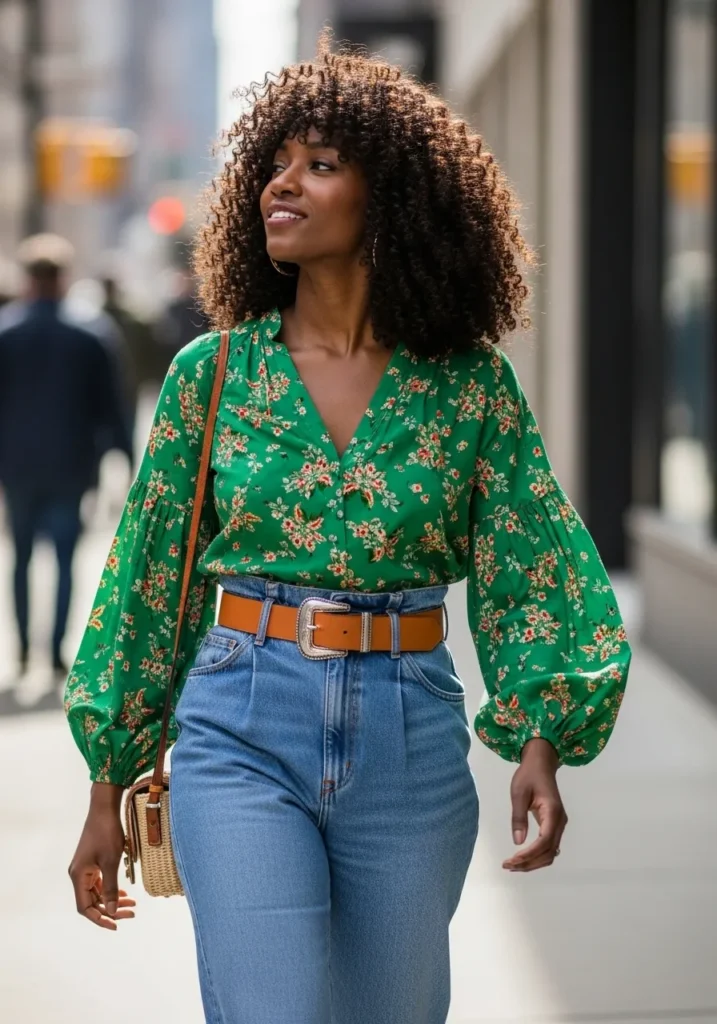 This look features a vibrant green floral blouse with flowy sleeves paired with classic high rise blue jeans and a warm brown belt. The blouse brings in all the spring energy with its color and print, while the denim keeps things grounded and wearable. A small woven bag adds a charming finishing touch.