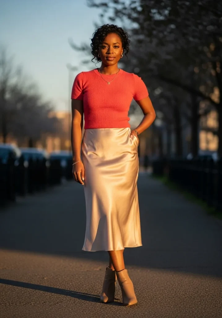 A coral fitted knit top is styled with a silky champagne midi skirt that catches the light beautifully. The smooth satin fabric adds elegance, while the short sleeves keep the look casual enough for daytime. Neutral ankle boots tie everything together in a clean and modern way.