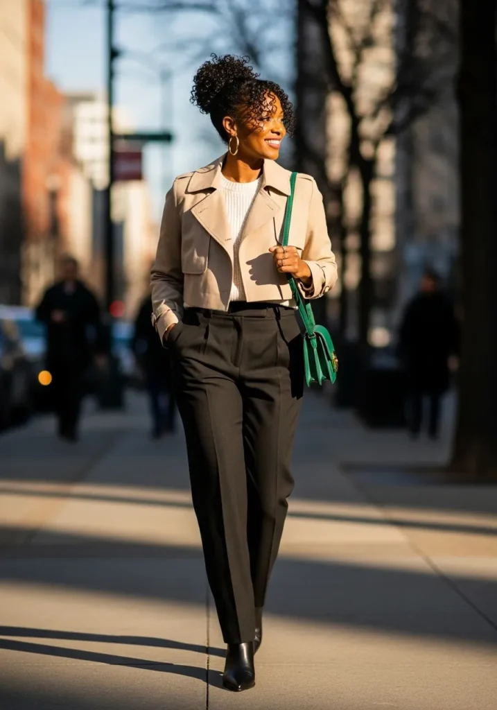 This outfit combines a cropped beige jacket layered over a simple knit top, paired with sleek black tailored trousers. The proportions feel intentional and sharp, and the pop of green from the handbag adds a fun and confident twist. Ankle boots keep the look city ready and polished.