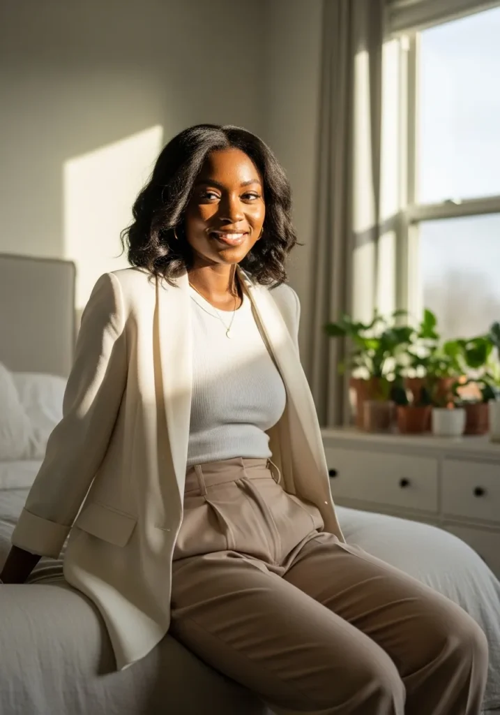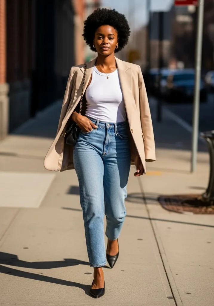 A creamy white tank is layered under a relaxed beige blazer and paired with matching high waist trousers. The soft tones and natural light give this look a warm and inviting feel. Everything looks comfortable yet refined, like effortless elegance done right.