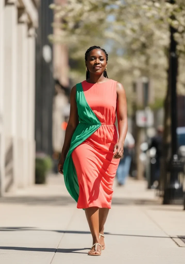 This sleeveless midi dress blends coral and green tones in a soft color block design that feels playful and fresh. The fabric drapes nicely and moves with each step, giving the whole look a breezy spring vibe. Flat sandals keep it grounded and comfortable for walking.