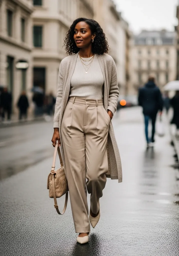 A soft neutral cardigan is layered over a fitted ribbed top and paired with high waist beige trousers. The textures feel cozy and refined, while the clean color palette keeps everything polished. A structured handbag adds a subtle touch of sophistication.