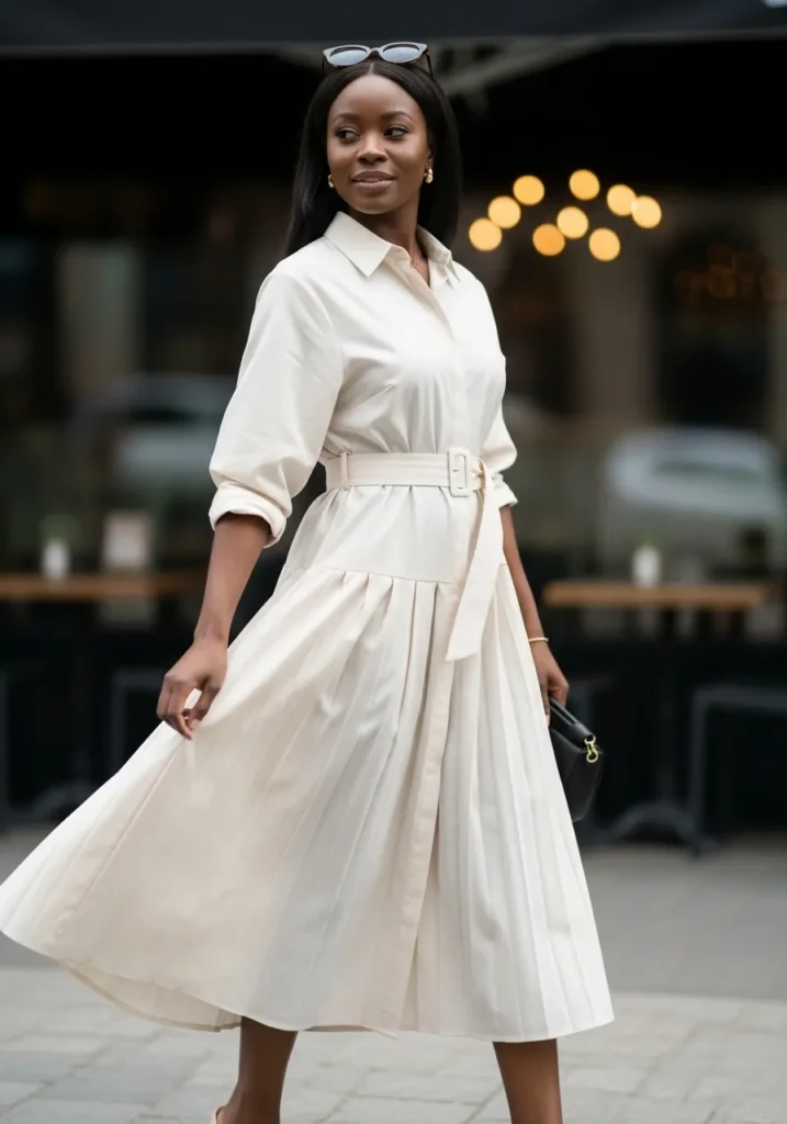 This creamy shirt dress features soft pleats and a cinched waist that creates beautiful movement as you walk. The lightweight fabric feels airy and elegant, while the relaxed sleeves keep it approachable. Simple accessories let the dress remain the star.