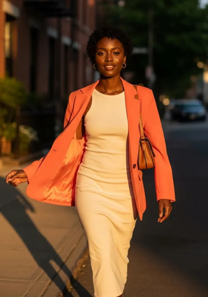 A fitted neutral midi dress is paired with a vibrant coral blazer that instantly brightens the look. The clean lines of the dress balance the bold outer layer, creating a confident and modern silhouette. A structured shoulder bag completes the outfit beautifully.