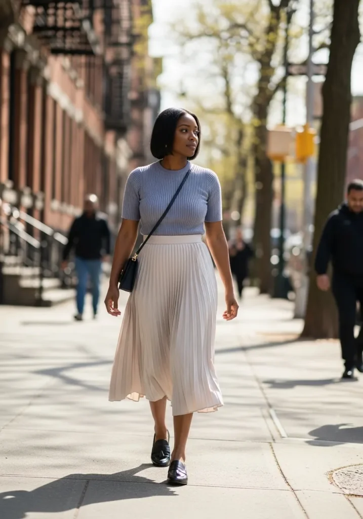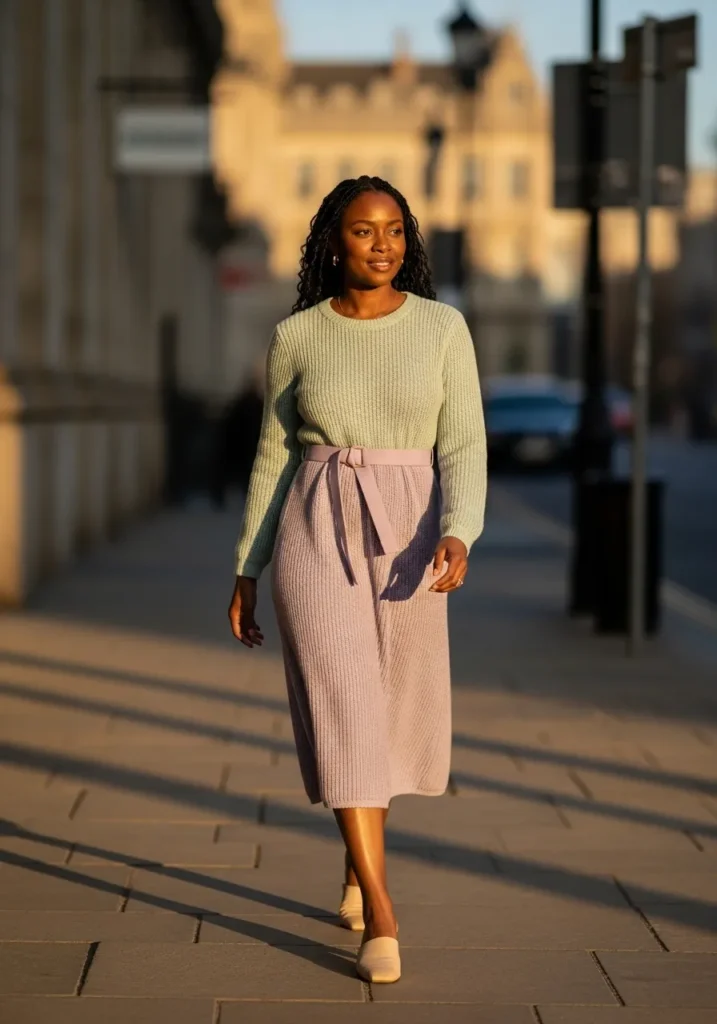 This outfit features a soft green knit sweater tucked into a belted pastel midi skirt. The textures work beautifully together and the length of the skirt gives the look a graceful flow. Neutral flats keep it comfortable and practical.