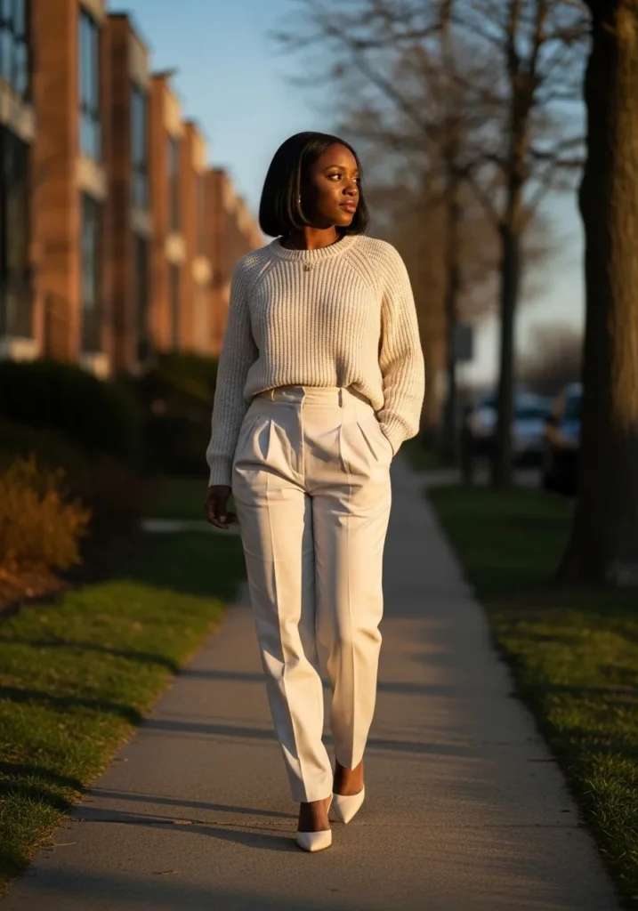 This look features a cozy cream knit sweater tucked into crisp high waisted neutral trousers. The soft texture of the sweater balances beautifully with the clean tailored lines of the pants. Finished with pointed toe heels this outfit feels warm chic and quietly confident.